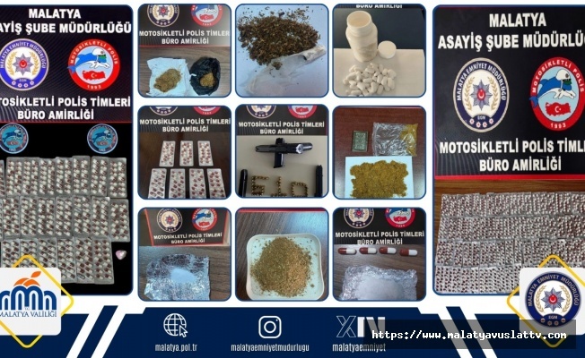 Malatya’da Yunus olarak bilinen motosikletli polis timleri tarafından gerçekleştirilen denetim ve operasyonlarda çok sayıda uyuşturucu madde ile ruhsatsız silah ele geçirilirken 21 şüpheli hakkında işlem yapıldı.