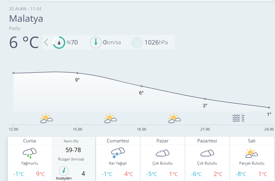 Meteoroloji kaynaklarından alınan güncel verilere göre, Malatya’da 26 Aralık Cuma gününden itibaren soğuk ve yağışlı hava etkili olacak. Hava sıcaklıklarının kademeli olarak düşmesiyle birlikte özellikle gece saatlerinde don ve buzlanma riskinin artması bekleniyor.